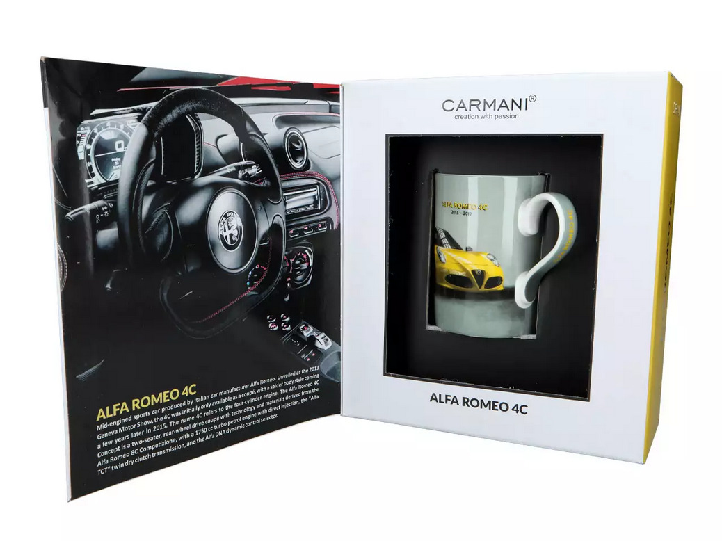 Jeśli kochasz zapach benzyny i dźwięk silnika, ten kubek jest dla Ciebie. Stylowy porcelanowy kubek z kolekcji Carmani przedstawia kultowy model Alfa Romeo 4C (2013–2019) – symbol włoskiego temperamentu i elegancji.